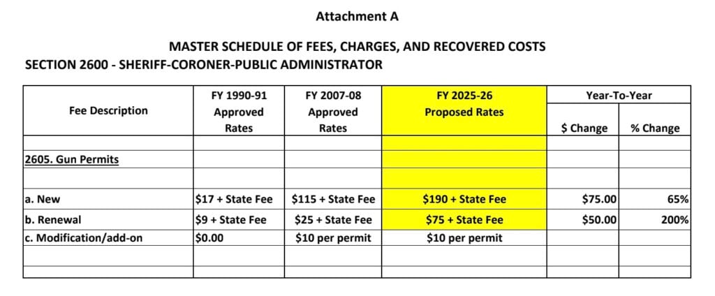On October 21, 2025, the Board voted to amend the county’s Master Schedule of Fees for the Sheriff-Coroner-Public Administrator’s Office. The changes include a 65% increase for new CCW permits — from $115 to $190 plus state fees — and a 200% increase for renewals, which will now cost $75 plus state fees. The modification or add-on fee remains at $10 per permit.