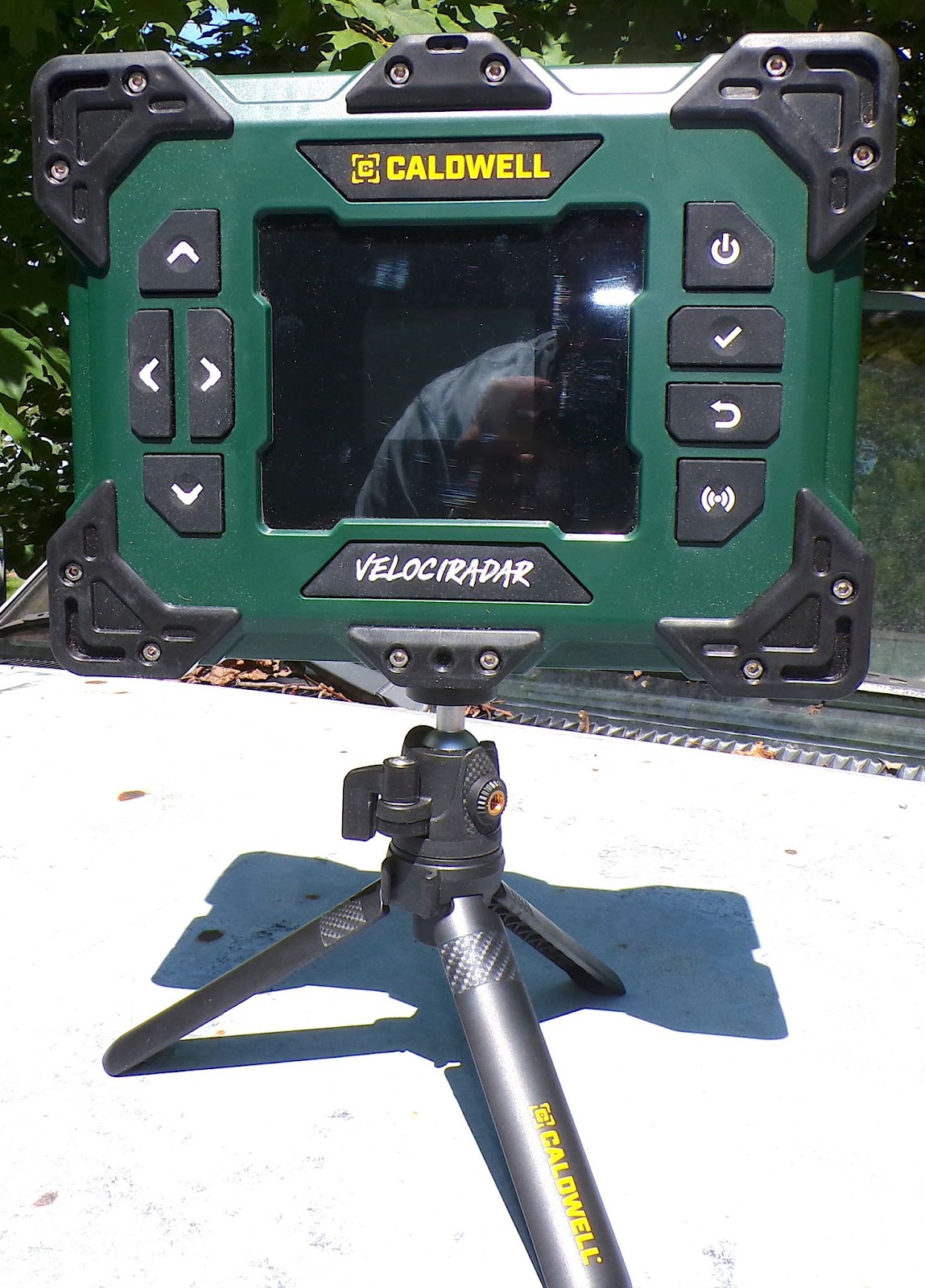 The Caldwell is a bit different. It needs to be level and, to that end, includes a swiveling ball/socket head. You then place the chrono with its back facing the target and sight through a hole at its top center, aiming at the target. This is necessary to measure downrange ballistics.