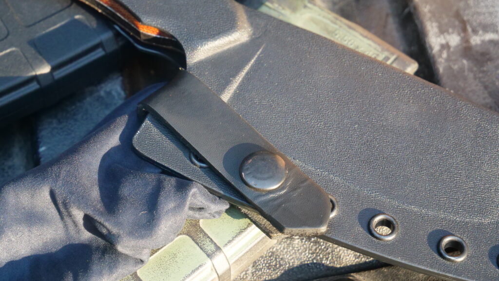The Kydex sheath is robust, but—here comes my biggest gripe—the retention strap from the factory is pretty stiff and needs a fair amount of use to become easy to reattach with just one hand. You could also probably soak it in warm water and then re-stretch the strap that way, but for me, it took a few days of snapping and unsnapping the strap to get it to a reasonable balance between retention and ease of use.