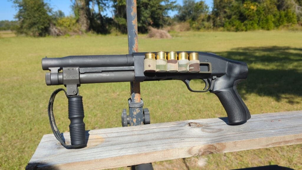 I fired some standard buckshot through the gun; I fired a lot of Fiocchi Defense Dynamics reduced-recoil buckshot. Firing this ammo was a literal and figurative blast. You can actually feel the gas leaving the barrel. With the reduced recoil ammo, recoil wasn’t that bad at all, and I could put two of those Fiocchi rounds on target in about 1.1 seconds. Without a stock, you are going to sacrifice some performance and deal with some recoil.