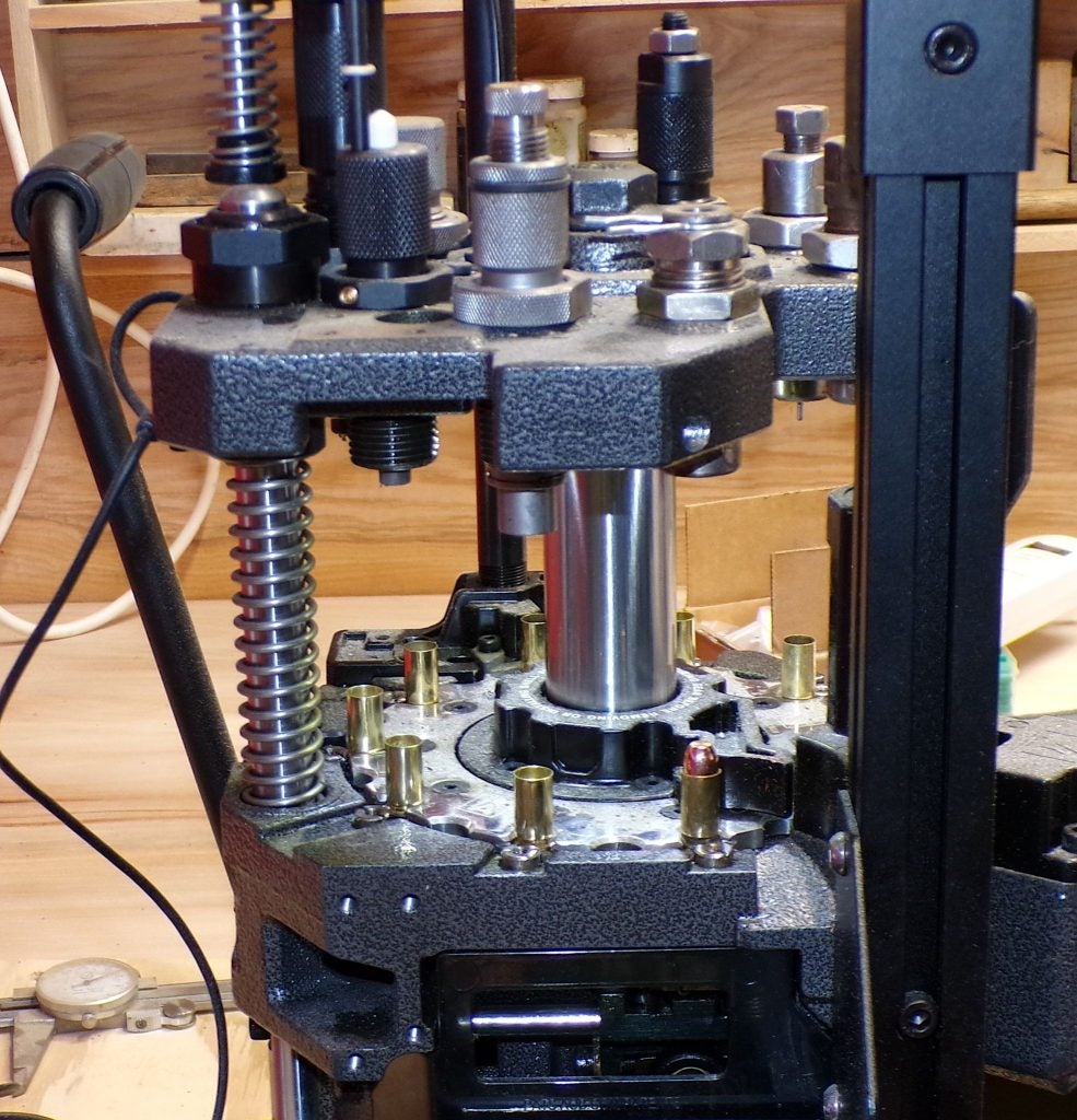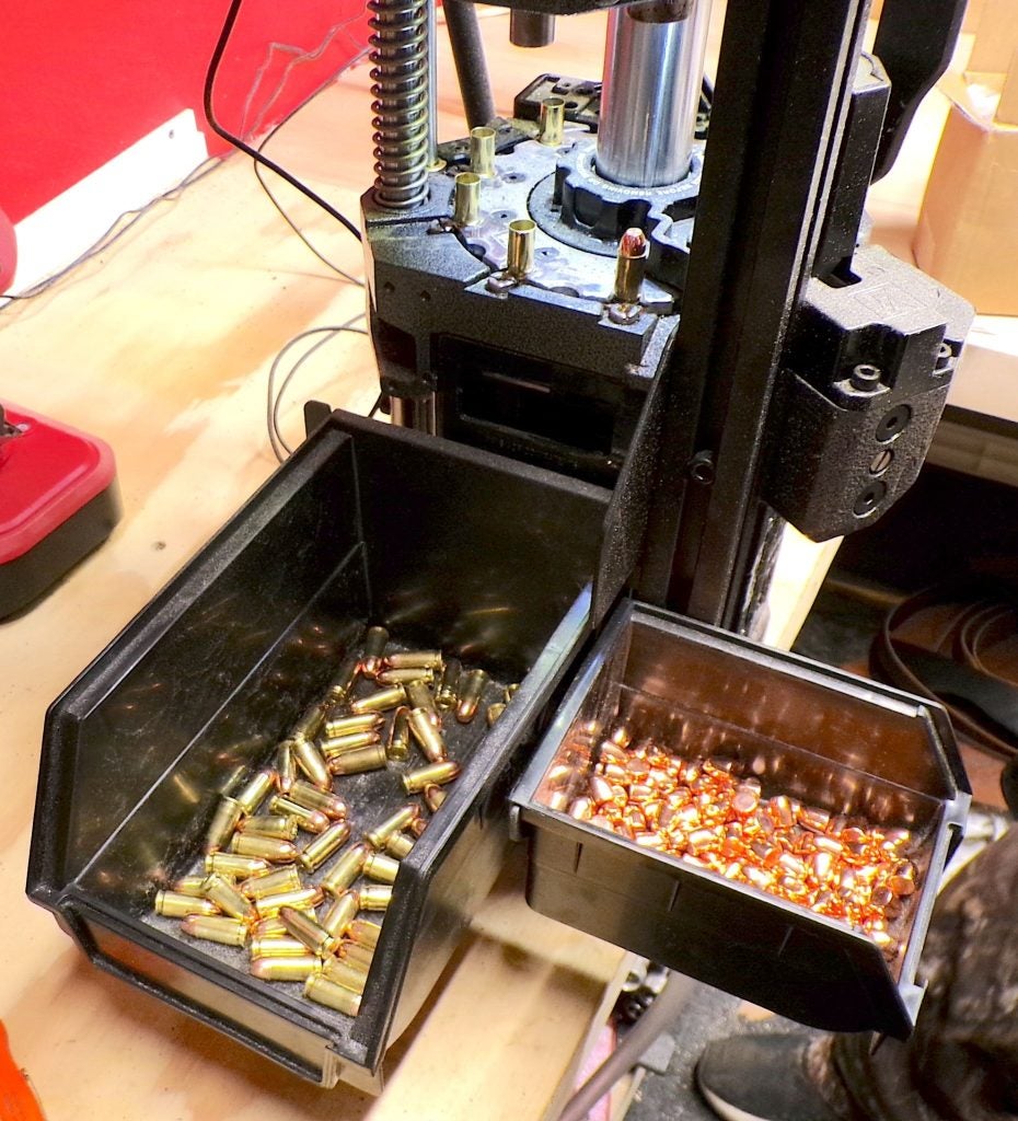 They are perfect for the uses I mentioned above, and are economical at under a nickel each. Below, here they are on parade as they progress through a Frankford Arsenal X-10 progressive press. (Side note: this is one of the finest progressive presses my son or I have ever owned.