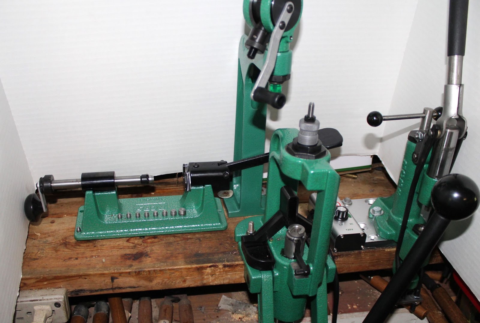 L-R: RCBS manual case trimmer, press with Uni-Flow III powder measure behind it, Lub-A-Matic bullet lubricator/sizer