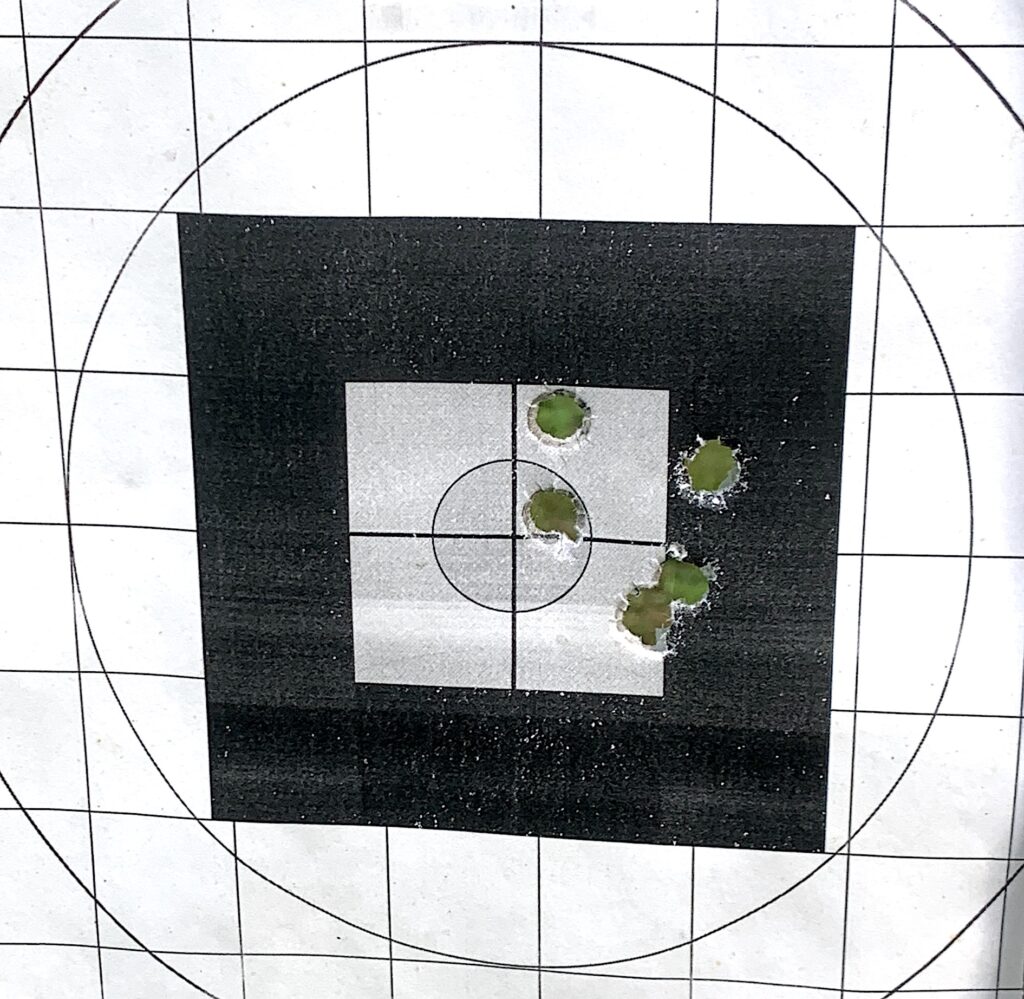 The proof is in the pudding, they say. Well, here is the “pudding”… my first 25-yard target with the above load. Velocity is 1152 fps, energy 531 ft-lbs. The extreme spread was only 18.4, and the standard deviation, which should be low, is 7.4. I’ll take it.