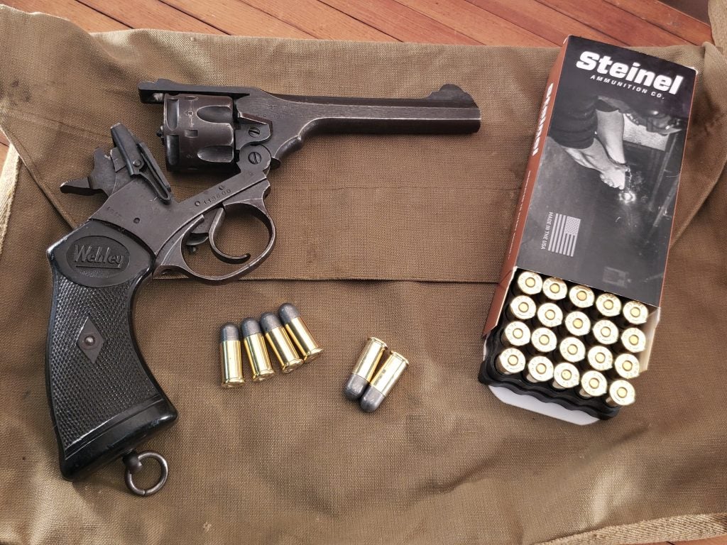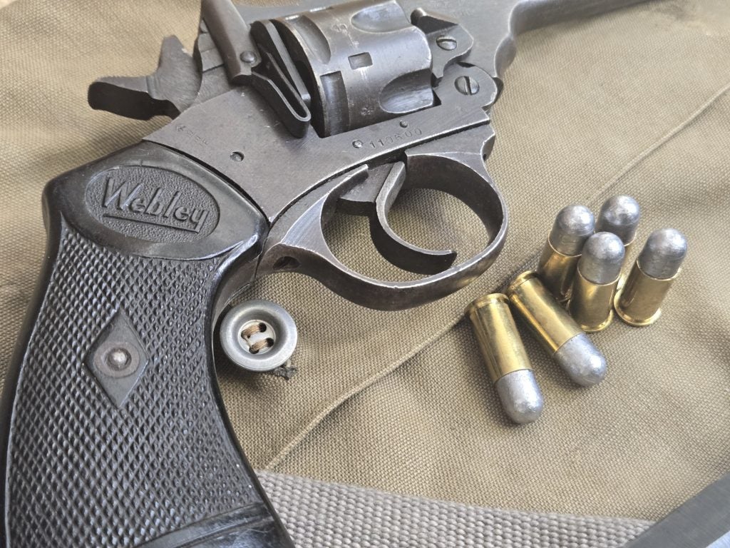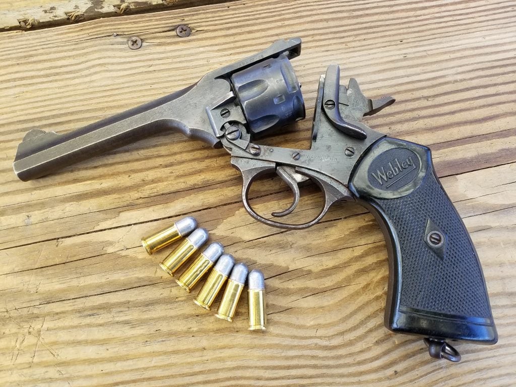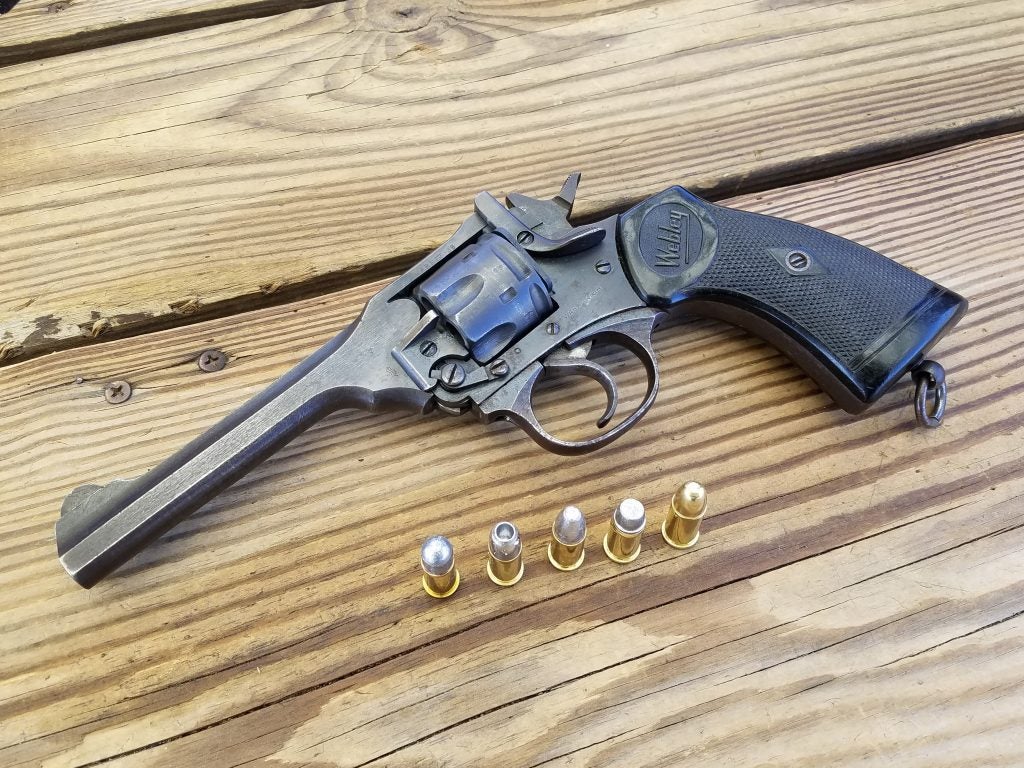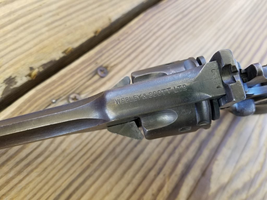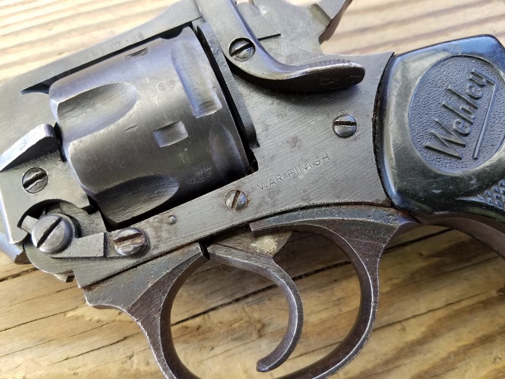 I’ve used my Webleys a good bit over the years. I have two MK IV’s, a wartime model with a 5-inch barrel, and a postwar 4-inch police model from the early 1950s. The wartime gun, marked with the rough “Wartime Finish,” is in good condition today, though it didn’t start that way. When I acquired it, it was heavily rusted and nearly relegated to parts duty, but it cleaned up surprisingly well.