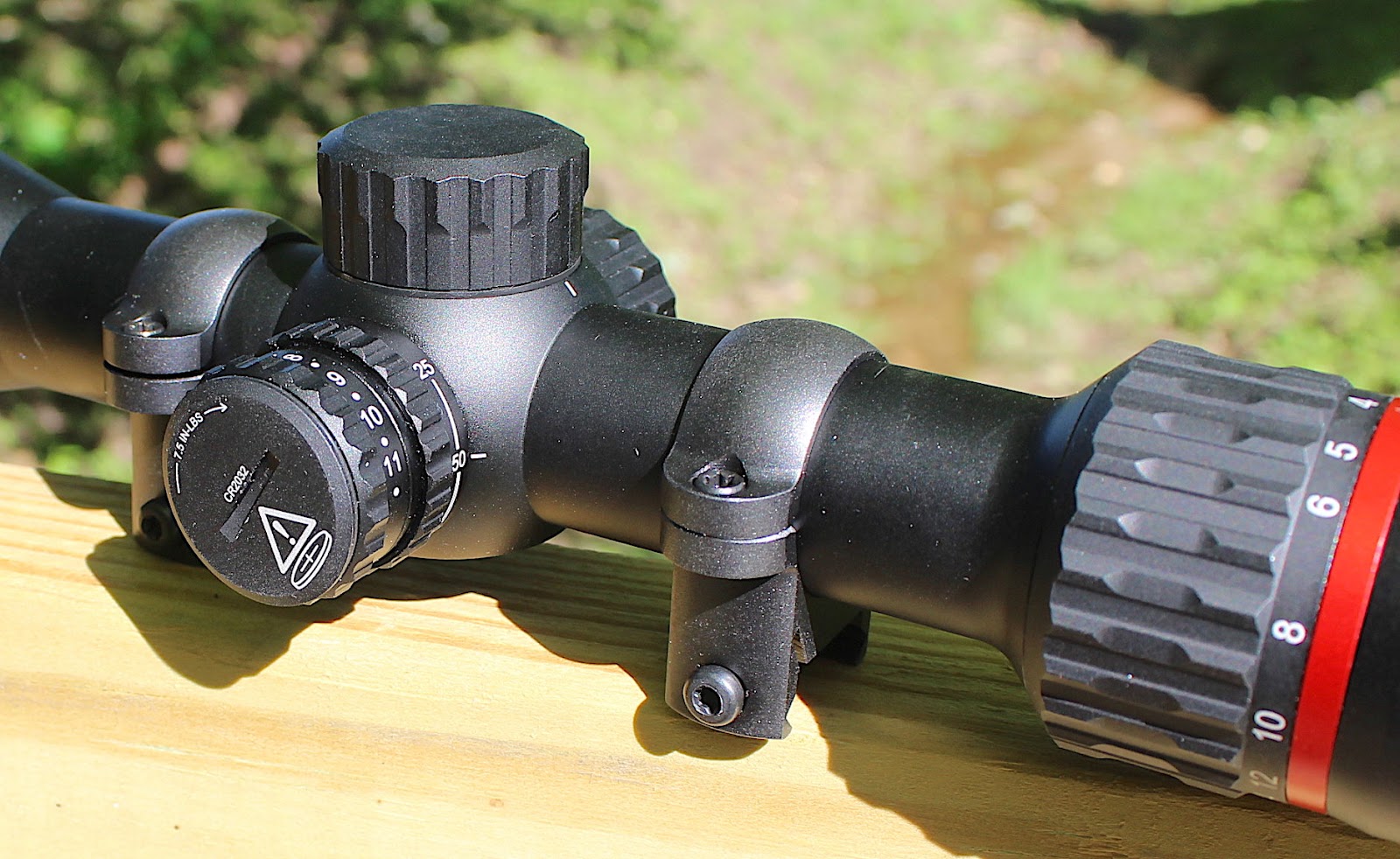Here we see the adjuster knob (outer knob) for reticle illumination and the parallax adjustment knob (inner ring).
