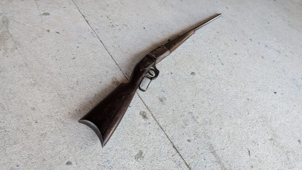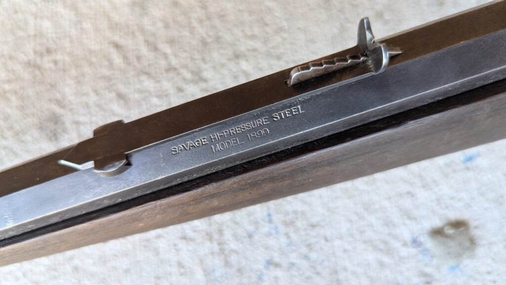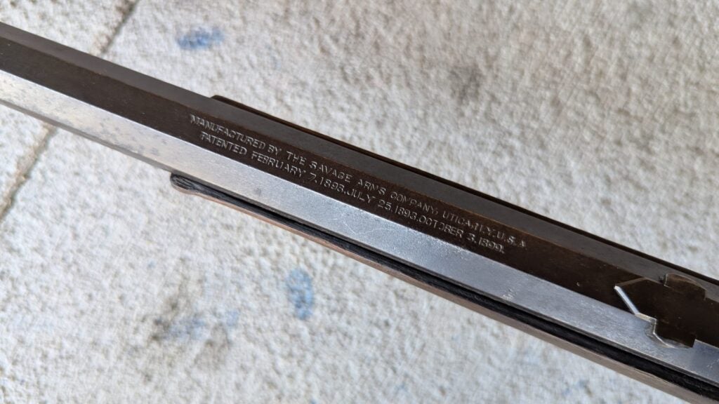 Savage began referring to these guns as the Model 99 in 1920, and this is marked 1899, telling me it’s at least 105 years old. The crescent-style stock, with its classic perch belly configuration and half-octagonal, half-round barrel, firmly places it in the Model 1899C world.