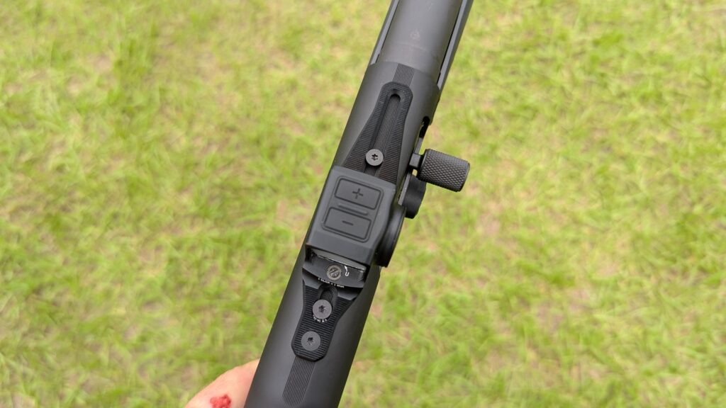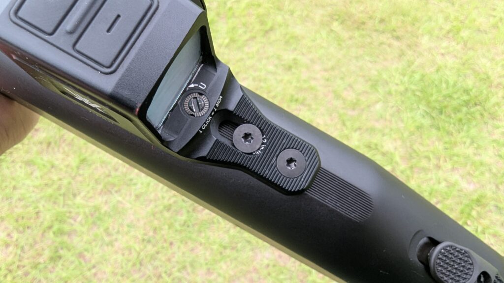 The battery mounts to the side, which also helps keep the optic sitting low. The buttons are positioned on top of the optic. It’s an interesting placement, but it works just fine and keeps the buttons from leaning against the shooter while the gun’s carried.