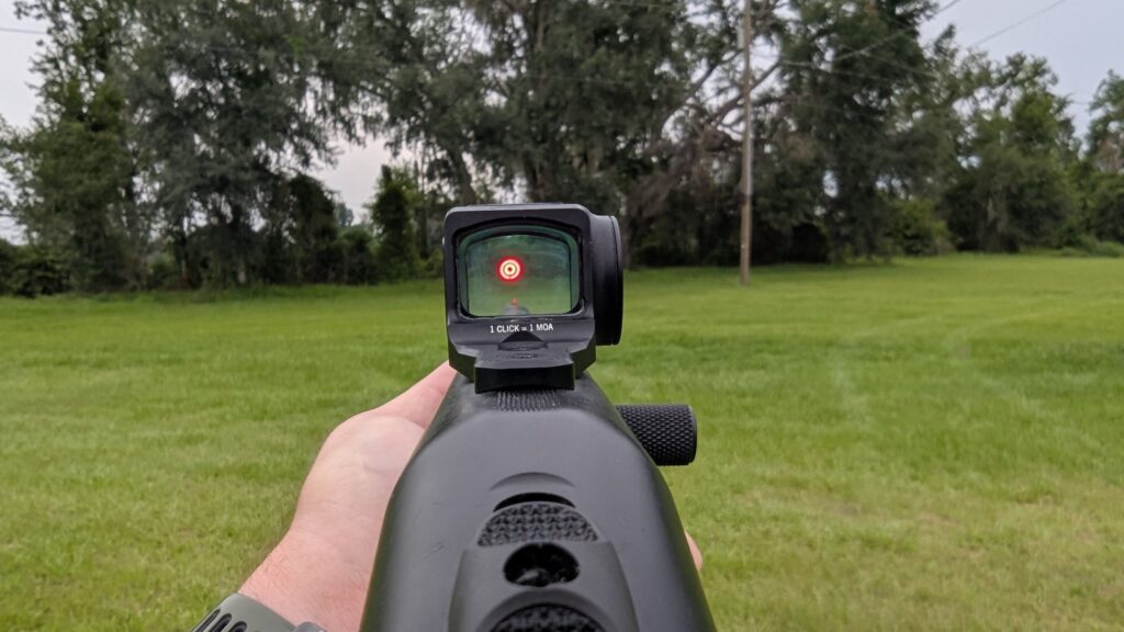 On a three-target transition drill, the optic’s design showed its strengths. I could engage three targets placed seven yards from each other in 2.45 seconds with full power buckshot. Just swing the big and bright reticles from target to target and go!