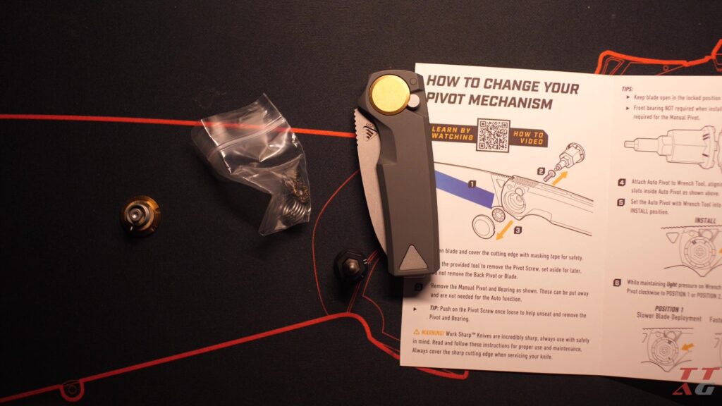 The knife ships with a manual pivot mechanism installed. Along with the knife, you receive an automatic pivot cartridge packed with a torsion spring, plus a specialized wrench tool (a 2mm hex) and a magnetic key to assist installation and removal.